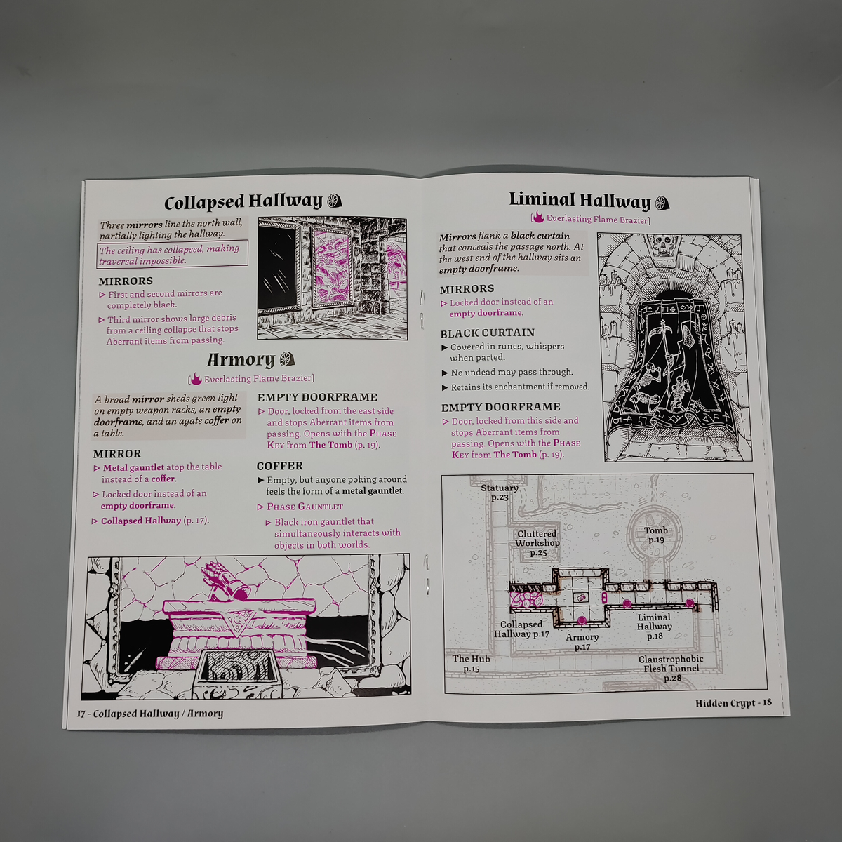 The big takeaway is that this one spread gives you everything that you need to run these three rooms without flipping the page! It even gives a little mini-map that shows where you are in the dungeon and what rooms are nearby, though I'd consider that extra credit and not strictly necessary. Each room is visually contained in a little block, the headers and formatting all work together to highlight the important info and make exploring the room really easy to run, and there's a really excellent use of visuals to help clarify some of the more complicated situations.